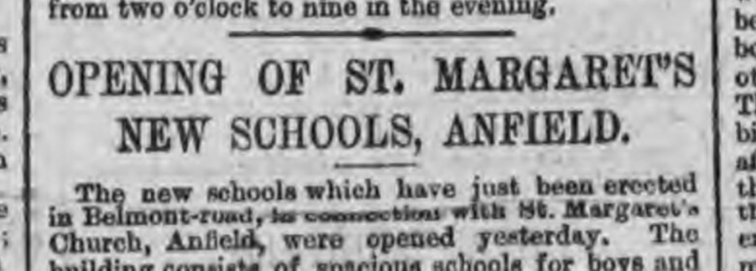 The new schools which have just been erected in Belmont-road, in connection with St. Margaret’s Church, Anfield, were opened yesterday. The building consists of spacious schools for boys and girls, with classrooms having accommodation for 472 children, and it is hoped that an infant school will be added at some future period. An excellent house for a schoolmistress has also been provided.