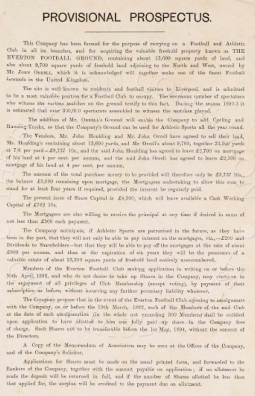 Considerable surprise was expressed by the members of the Everton Football Club upon proof being obtained that a company had actually been formed with the title of the “Everton Football club and Athletic Grounds Company, Limited.” Which was registered in Somerset House, on Tuesday last, and to the articles of association, of which the signatures appended are Albert Edward Berry, William Houlding, Alex Nisbet, John James Ramsay, John Dermott, William Francis Evans, and John McKenna.