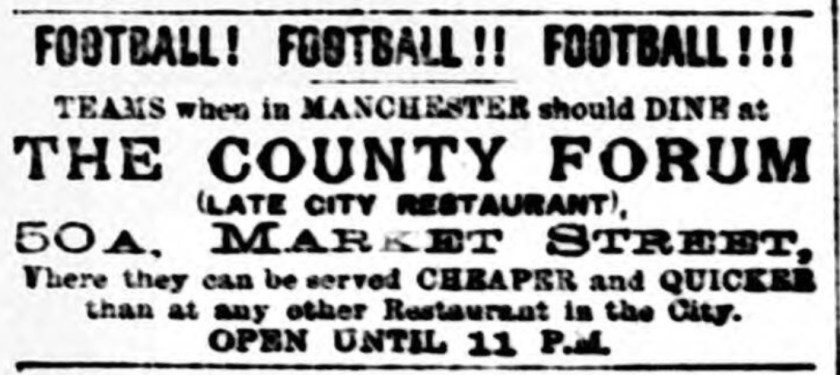 Teams when in Manchester should dine at the County Forum (late City Restaurant), 50 A Market Street.
