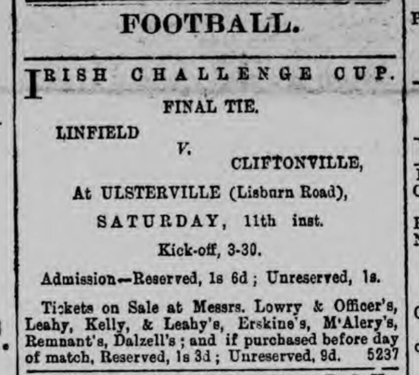 Match: Irish FA Cup, Final, at Lisburn Road (Ulsterville), kick-off: 15:30.