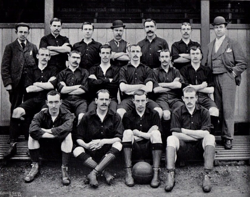 Back row (left to right): Paddy O’Brien, Joe Powell, Frank McAvoy, Hollis (trainer), Caesar Jenkyns, Frederick Davies, James Boyle.