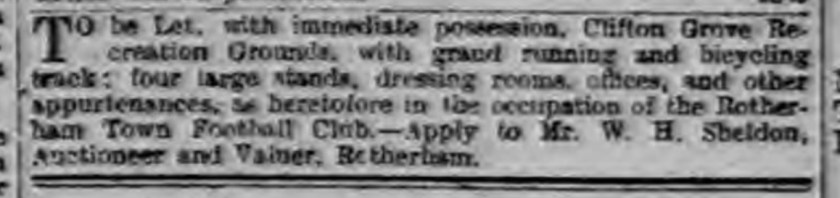 To be let, with immediate possession, Clifton Grove Recreation Grounds, with grand running and bicycling track; four large stands, dressing rooms, offices, and other appurtenances, as heretofore in the occupation of the Rotherham Town Football Club. – Apply to Mr. W.H. Sheldon, Auctioneer and Valuer, Rotherham.