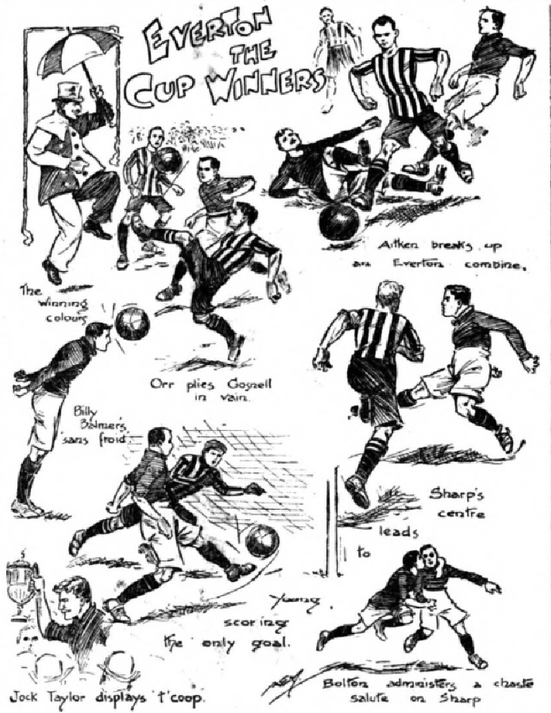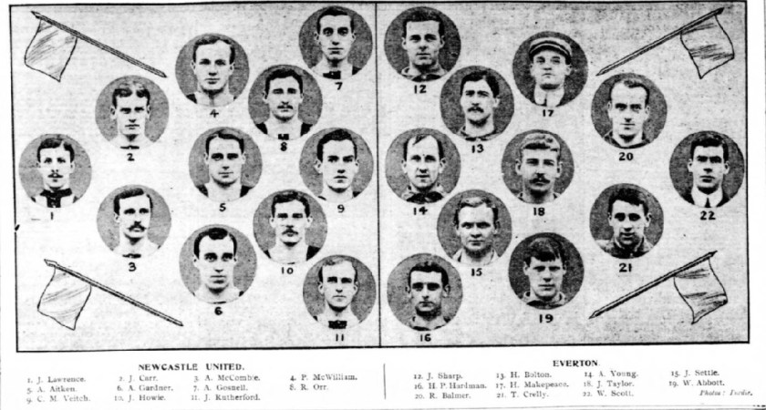 Everton (2-3-5): William Scott, William Balmer, Jack Crelley, Harry Makepeace, Jack Taylor (C), Walter Abbott, Jack Sharp, Hugh Bolton, Alex “Sandy” Young, Jimmy Settle, Harold Hardman.