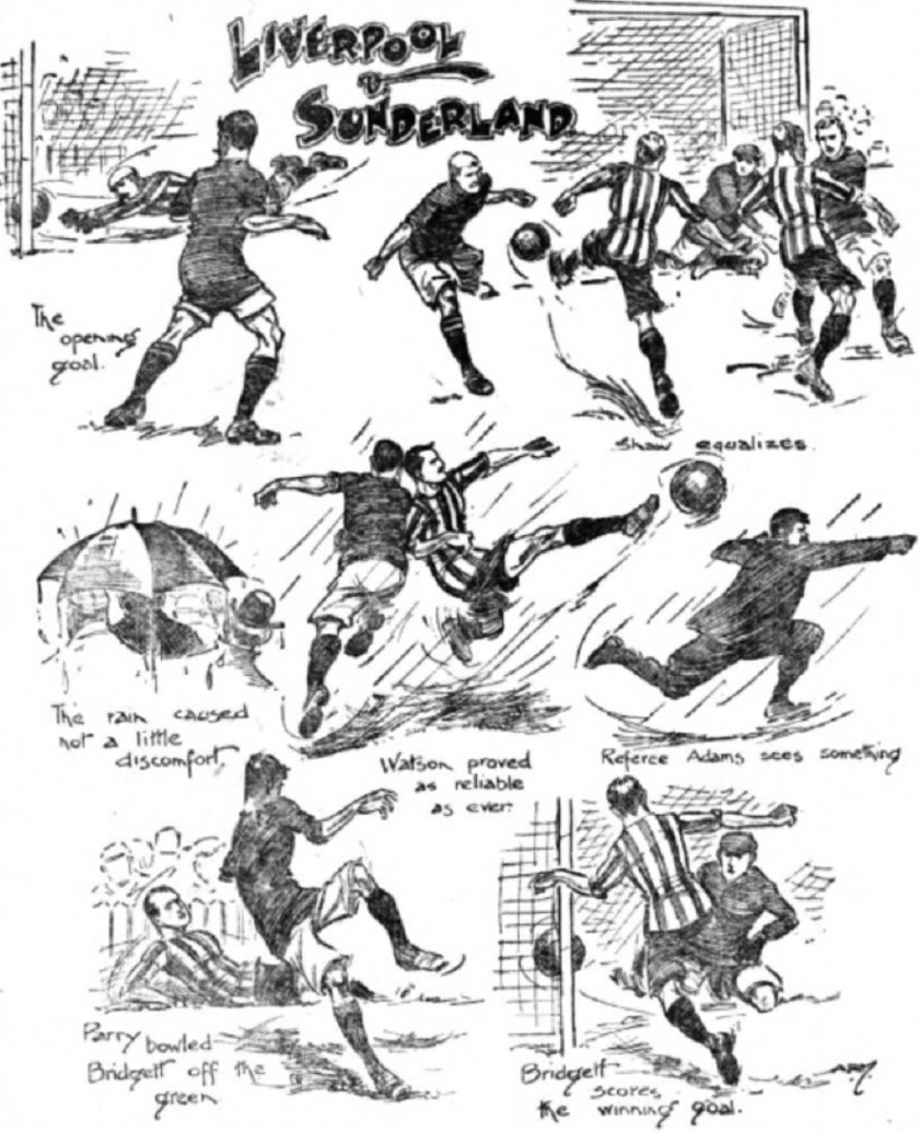 The Liverpool Football Club received its first defeat of the season on Saturday. The above sketches comprises our football artist’s impressions of incidents.