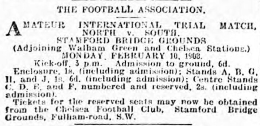 Match: International Amateur trial, at Stamford Bridge, kick-off: 15:00.