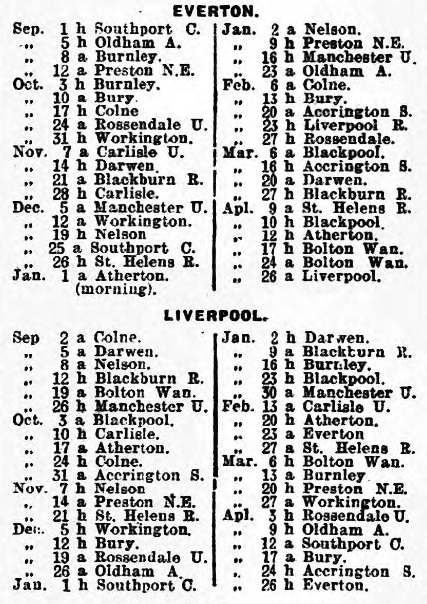 On the way to Llandudno last Saturday, where the Lancashire Combination delegates were entertained by the directors of the Everton club, the fixtures for next season’s First Division were completed as appended: –