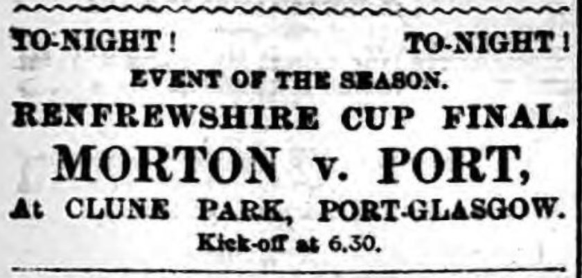 Match: Renfrewshire Cup, Final (First Leg), at Clune Park, kick-off: 18:30.
