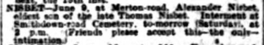 The death has occurred at Liverpool of Mr. Alex Nisbet, who, in the earlier days of the Everton Football Club, acted as its secretary, and in that capacity attended the conference at Birmingham when the Football League was formed under Mr. William Macgregor’s scheme. Mr. Nisbet was well known in bowling circles.