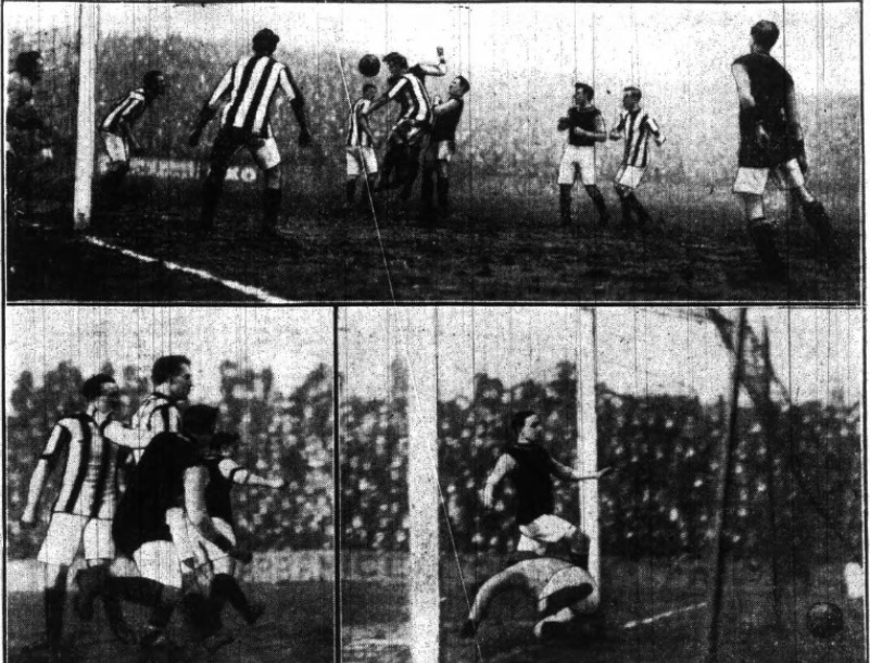 Directly afterwards Dawson advanced from his charge as the Liverpool centre came down again in menacing fashion and beat the backs. The half backs had either got so far up the field as to be unable to recover, or were inclined to treat the situation lightly. In the semi darkness Miller got in a terrific shot, and Dawson fisted out in nothing short of wonderful fashion. It was really surprising that he could see the ball, and his feat deserved the cheers it elicited. The ball rose in the air and turned over for a corner.