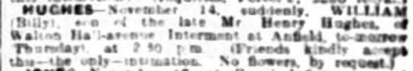 As Mr. Billy Hughes, of 41 Hallville Road, Mossley Hill, driving a motor-cycle with a sidecar and a lady, was leaving Woodside ferry approach in the direction of Chester Street, he was seen to fall from the machine, which ran on for a few yards and then stopped. Mr. Hughes was immediately attended to by passersby but he was beyond help, and must have died instantaneously.