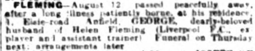 1911 Census: George Fleming, age 39, living with his wife Helen (age 30), son James (age 4) and daughter Helen (age 6) in number 1 Elise Road. George’s occupation is “Liverpool Football Club player.” His birthplace is given as Broxburn, Scotland.
