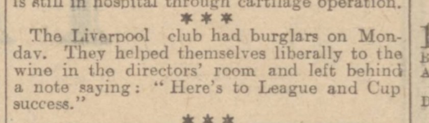 The Liverpool club had burglars on Monday. They helped themselves literally to the wine in the directors’ room and left a note saying:
