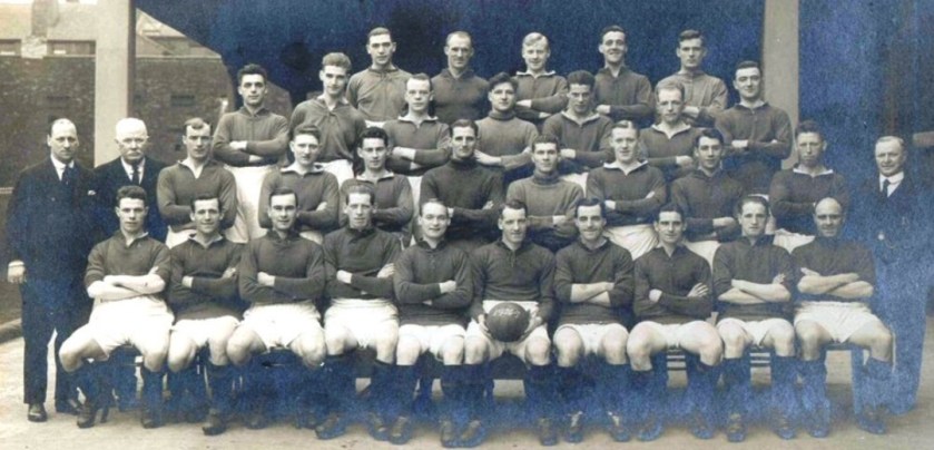 Second row standing (left to right): George Patterson (Secretary), William Connell (Trainer), David Pratt, Tom Scott, Patrick McDade, Arthur Riley, Elisha Scott, William Cockburn, Dick Edmed, Dick Forshaw, Matt McQueen (Manager).