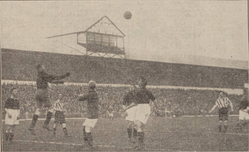 Image from Sheffield Daily Telegraph: September 11, 1928, showing Elisha Scott saving a shot from Fred Tunstall.