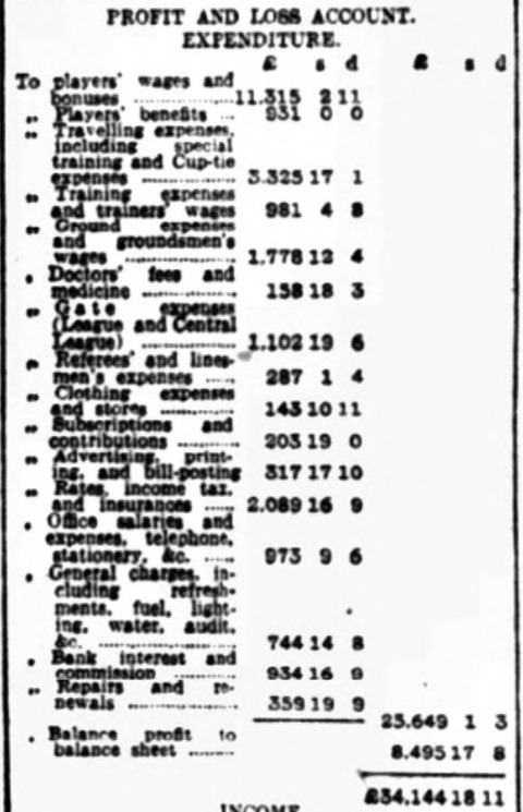 Players’ wages and bonuses cost £11,315 2s. 11d., while players’ benefits amounted to £931, and travelling expenses, cup training, &c., to £3,325 17s. 1d.