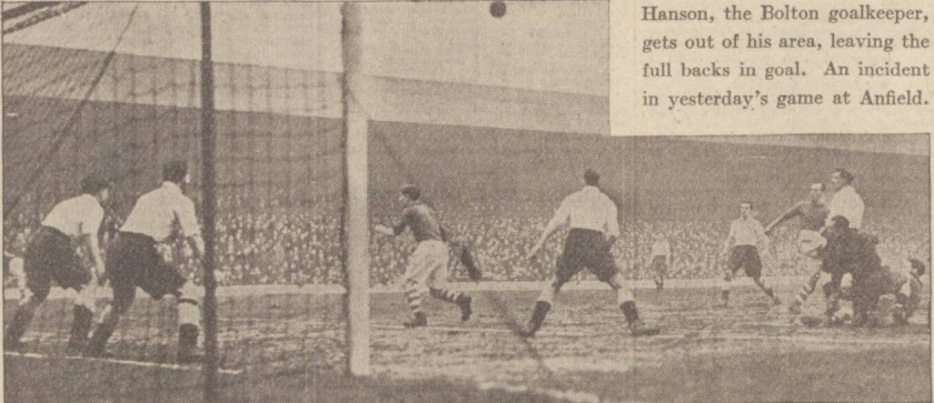 Busby was half a team in himself. While he seems to get twice as much of the ball as anyone else when he is a wing half-back, his conversion to centre-half meant that he was even busier. He gave lessons in bringing Kemp to his aid, and those who decry the reserve pass to the goalkeeper cannot have the true conception of the value of such a move. Yet Busby was one of many heroes, and Phil Taylor’s work in four positions – he became a half-back for the second time when Ramsden resumed at left back late in the game – was also excellent. McInnes played as though the dishonour of being on the losing side at Anfield for the first time since he joined the club was solely his, and moved heaven and earth in his endeavours to stop Bolton and start Liverpool on the goalward path.