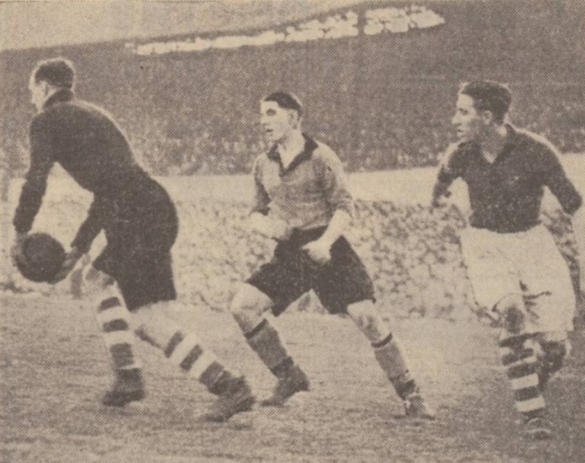 Dirk Kemp, the Liverpool goalkeeper, dashes out to clear from Dennis Westcott, Wolves’ inside forward (centre) at Molineux. Tom Bush, the Liverpool centre half, is on the right (Birmingham Daily Gazette: February 13, 1939).