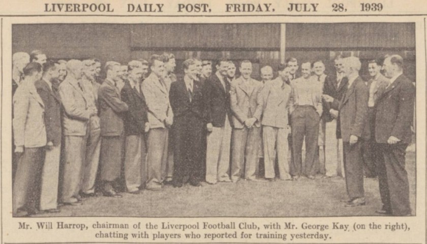 Liverpool players reported at the Anfield ground yesterday, and Everton receive their members at Goodison Park on Monday. Mr. William John Harrop, the chairman of the Liverpool club, welcomed the players, who were fit and happy. Mr. Harrop expressed the hope that in this season of numbers, Liverpool would finish No. 1. He and his colleagues on the board had every confidence and the utmost faith in the loyalty and ability of the players.