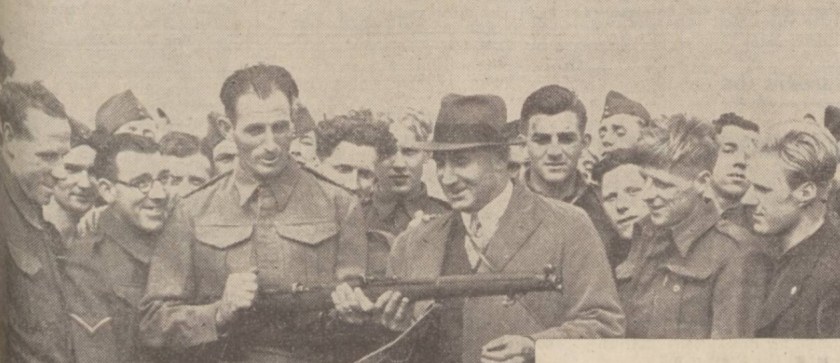 Members of Liverpool F.C. players in camp with the 9th Battalion King’s Liverpool Regiment in the Gower Peninsula. In the picture are Matt Busby (left), Arthur Riley (with rifle), Willie Fagan, and Jack Easdale (behind Riley), Mr. George Kay (team’s manager), Cyril Done, William Pinnington and Keith Peters.