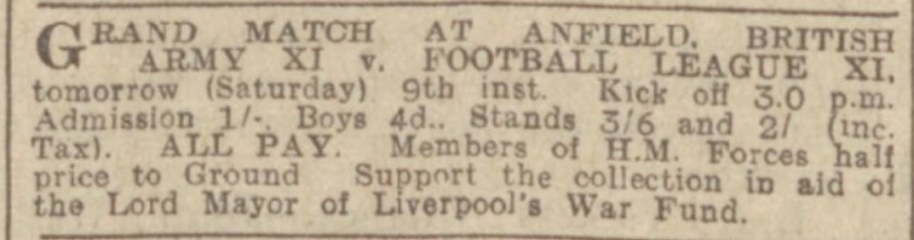 During the game – kick-off at 3 pm – there will be a collection for the Lord Mayor of Liverpool’s War Fund – a fund devoted to supplying comforts for Liverpool lads with the services.