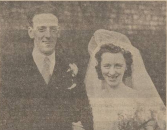 Miss Eileen Veronica Veney, daughter of Mr. and Mrs. J.H. Veney, Rimrose Hotel, Bootle, and Mr. Walter Gerard Halsall, a well-known footballer, after their wedding at St. Joan of Arc R.C. Church, Peel-road, Bootle, today.