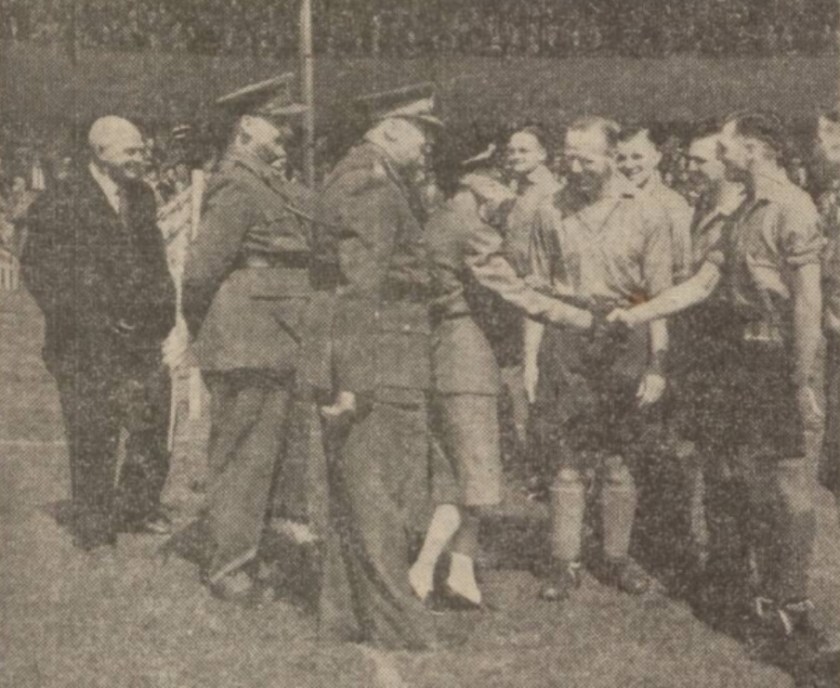 At the re-opening of Dens Park. The Lady Provost, Lady Wilson, is introduced to the Army players by their captain, Sergeant Major Matt Busby. Others in the photo are: – Mr. George Anderson (Dundee F.C. manager), Major Sloan, Lord Provost Sir Garnet Wilson.