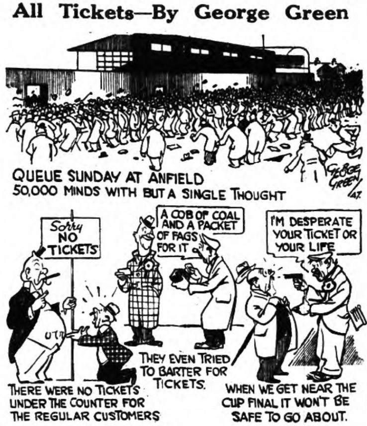 Sketch showing the huge interest in obtaining tickets for the FA Cup match between Liverpool and Birmingham City at Anfield.