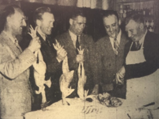 Members of Liverpool F.C. team, now in New York, like the feel of these fat chickens at the Hotel Claridge. Left to right: Jack Balmer, Albert Stubbins, Billy Liddell, hotel manager Lloyd Muller, and George Kay, team manager, who is helping to prepare a meal for the boys by cutting up one of the chickens.
