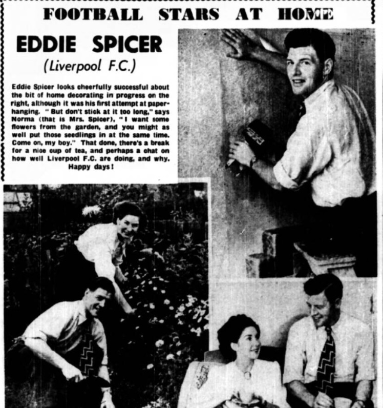 Eddie Spicer looks cheerfully successful about the bit of home decorating in progress on the right, although it was his first attempt at paper-hanging. “But don’t stick at it too long,” says Norma (that is Mrs. Spicer), “I want some flowers from the garden, and you might as well put those seedlings in at the same time. Come on, my boy.” That done, there’s a break for a nice cup of tea, and perhaps a chat on how well Liverpool F.C. are doing, and why. Happy Days!