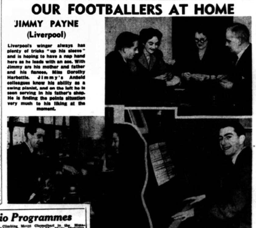 Liverpool’s winger always has plenty of tricks “up his sleeve” and is hoping to have a nap hand here as he leads with an ace. With Jimmy are his mother and father and his fiancee, Miss Dorothy Harbottle. Jimmy’s Anfield colleagues know his ability as a swing pianist, and on the left he is seen serving in his father’s shop. He is finding the points situation very much to his liking at the moment.