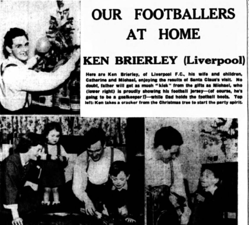 Here are Ken Brierley, of Liverpool F.C., his wife and children, Catherine and Michael, enjoying the results of Santa Claus’s visit. No doubt, father will get as much “kick” from the gifts as Michael, who (lower right) is proudly showing his football jersey – (of course, he’s going to be a goalkeeper) – while Dad holds the football boots. Top left: Ken takes a cracker from the Christmas tree to start the party spirit.