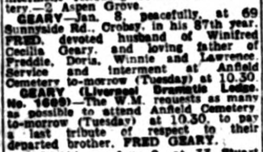 Mr. Fred Geary, a famous Everton centre-forward of more than 60 years ago, died this morning at 69 Sunnyside Road, Great Crosby. He would have been 87 in a fortnight’s time.