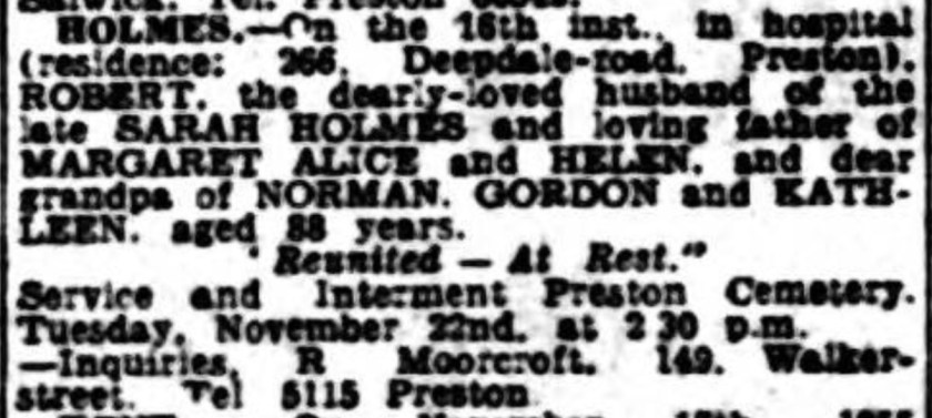 A great footballer of the old days, Mr. Bob Holmes, died at his native Preston to-day, aged 87. He played as a full-back for England seven times and was the last surviving member of the famed Preston North End “Invincibles” team of 1888-89 that accomplished the rare double of winning both League and Cup honours in one season. Aston Villa did likewise in 1897 and the feat has not been achieved since.