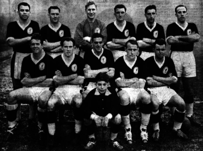 Back row (left to right): John Molyneux, Johnny Wheeler, Tommy Younger, Dick White, Geoff Twentyman, Ronnie Moran.
