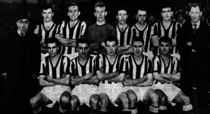 Front row (left to right): Fred Morris, Jimmy Melia, Louis Bimpson, Jimmy Harrower, Alan A’Court. On ground, D. Goodman (mascot).