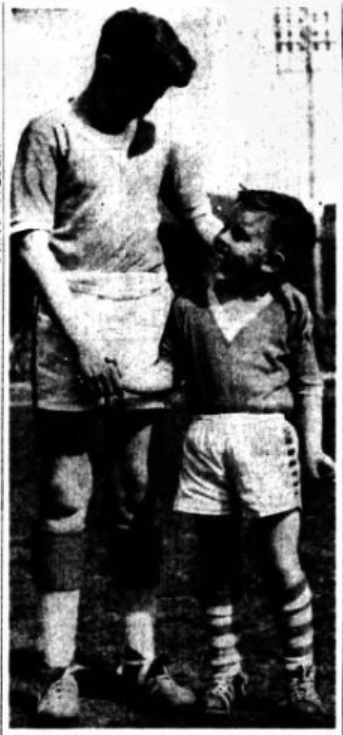 Liverpool F.C. will have a new mascot next season – a youngster who has already appeared on the pitch in a learning capacity. The boy who has been mascot for the past 10 years is 13-years-old David Goodman, of Geneva Road, Wallasey (left), who has been grooming his successor, four-years-old Leslie McCann, of Gladstone Road, Liverpool (right). David, retiring with regret due to the years putting inches on him and putting him out of the mascot class, is shown here with the new boy.