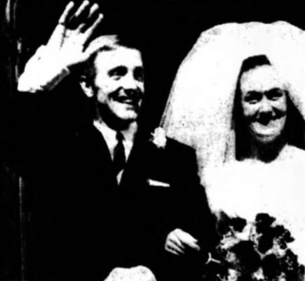 Peter Thompson, the Liverpool and England winger, son of Mr. and Mrs. E. Thompson, of 51 Lingmoor Way, Carlisle, waves to the fans who greeted him as he emerged from St. Mary the Virgin Church, West Derby, on Saturday, with his bride, Miss Barbara Ponting, daughter of Mr. and Mrs. W. Ponting, of Carrmanor Mount, Leeds.