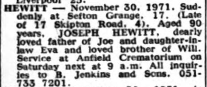 Passed away: November 30, 1971: Sefton Grange, Liverpool, in England.