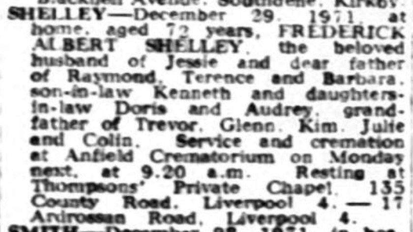 Albert Shelley, Liverpool’s former first team trainer and a popular figure at Anfield for 34 years, died last night. He was 73.