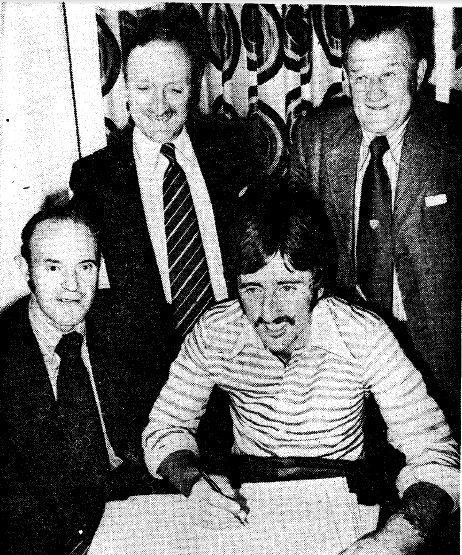 David Johnson signing the contract with secretary Peter Robinson (left). At the back Liverpool chairman John Smith, and manager Bob Paisley.