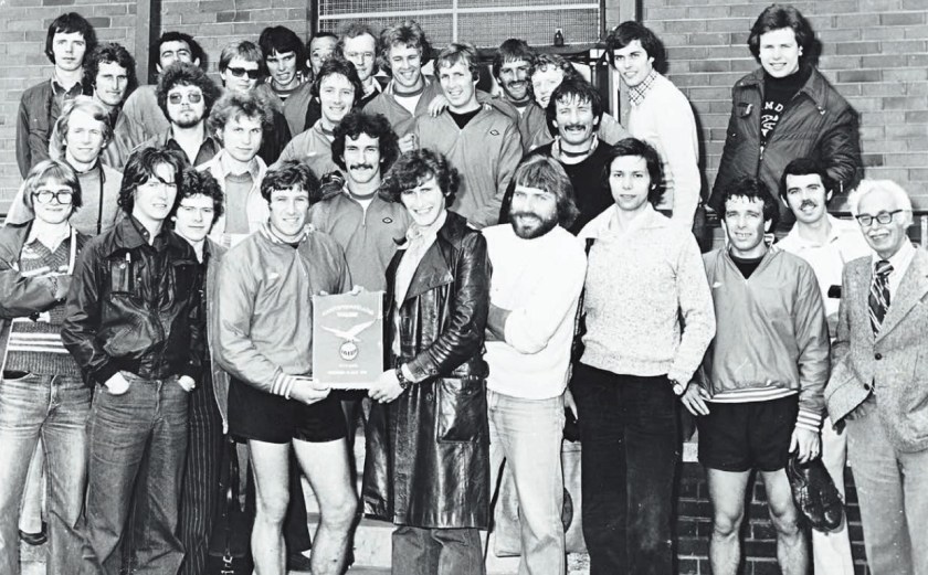 These Icelandic medical students on a four-week course in Liverpool, met Liverpool F.C. players during a visit to the training ground at Melwood. The students, who play for Valur back home, are Icelandic League champions and cup holders. Presenting Liverpool’s captain Emlyn Hughes with a pennant is Grimur Sæmundsen, on behalf of the students.