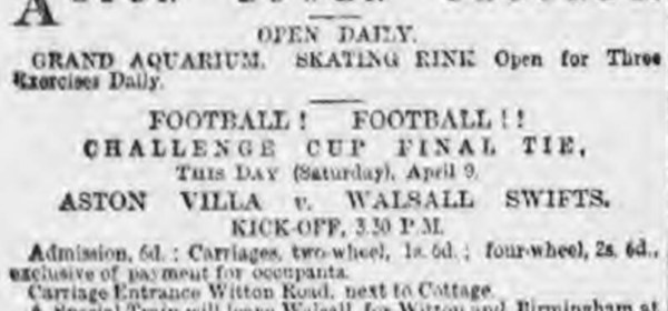 April 9, 1881 Match: Birmingham Cup, Final, at Aston Lower Grounds, kick-off: 16:00. Walsall Swifts – Aston Villa 1-0 (1-0). Attendance: 7,000. Walsall Swifts (2-3-5):