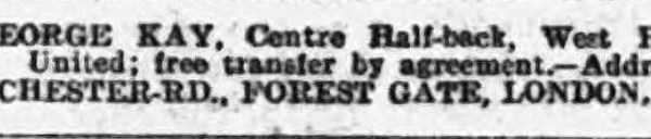 May 9, 1927 Situations wanted: GEORGE KAY, Centre half-back, West Ham United; free transfer by agreement. – Address: 35, Chester Road, Forest Gate, London, E7.