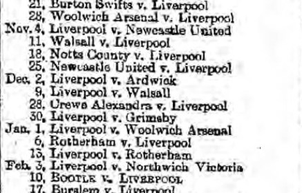 December 28, 1893 Match: Football League, Second Division, at Nantwich Road, kick-off: 14:15. Crewe Alexandra – Liverpool 0-5 (0-3). Attendance: 4,000. Referee: Mr. J.B. Brodie.