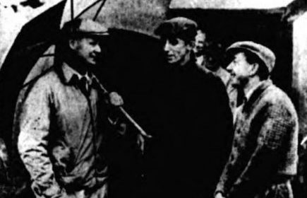 August 9, 1954 Despite the rain, manager Don Welsh has a sherry word for Laurie Hughes (the new captain) and Jimmy Payne, of Liverpool, before