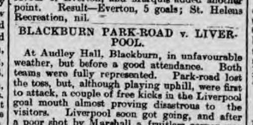 September 9, 1899 Match: Lancashire Combination, at Audley Hall, kick-off: 16:00. Blackburn Park Road – Liverpool Reserves 0-3 (0-1). Blackburn Park Road (2-3-5): Hill, Jackson,