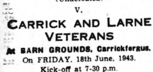 June 10, 1943 The Veterans’ challenge match on June 18 between Short & Harland’s Antiques and Carrick and Larne Veterans should arouse much interest. The