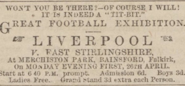 April 26, 1897 Match: Friendly, at Merchiston Park (Bainsford), kick-off: 18:40. East Stirlingshire – Liverpool 2-2 (0-0). Attendance: 2,500. Referee: Mr. McArthur (King’s Park). East