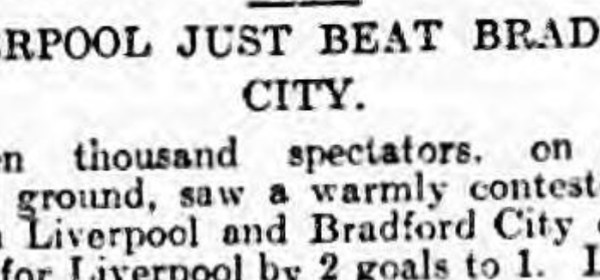 Saturday, January 14 – 1922 Match: Football League, First Division, at Anfield, kick-off: 14:30. Liverpool – Bradford City 2-1 (1-0). Attendance: 15,000. Referee: Mr. I.