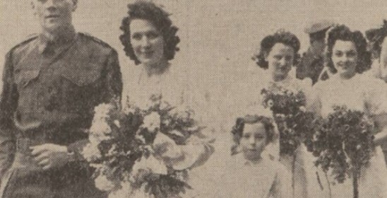 Wednesday, April 12 – 1944 Sergeant Dennis Westcott, R.A., of School Lane, Wallasey, and Miss Dorothy Stacey, of Walsall, with the bridesmaids leaving St. Hilary’s
